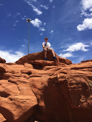 Left New Mexico and drove a nice short distance to the Grand Canyon!! We took today as a relaxing lazy day. There was a nice rest area in Arizona where we got to play on some rocks. And dispite the signs warning us, we did not see any poisonous snakes and insects that lived there (Thankfully!) Got to the GC and the boys went swimming in the pool, Shawn and I wandered around the town of Tusayan while the boys checked out the arcade. Then we all went to the South Rim to say "hello" to the canyon and do some grocery shopping at the Village Marketplace. Then we had a great Mexican dinner and I checked out the laundry room. Tomorrow is a full day hiking the South Rim.
